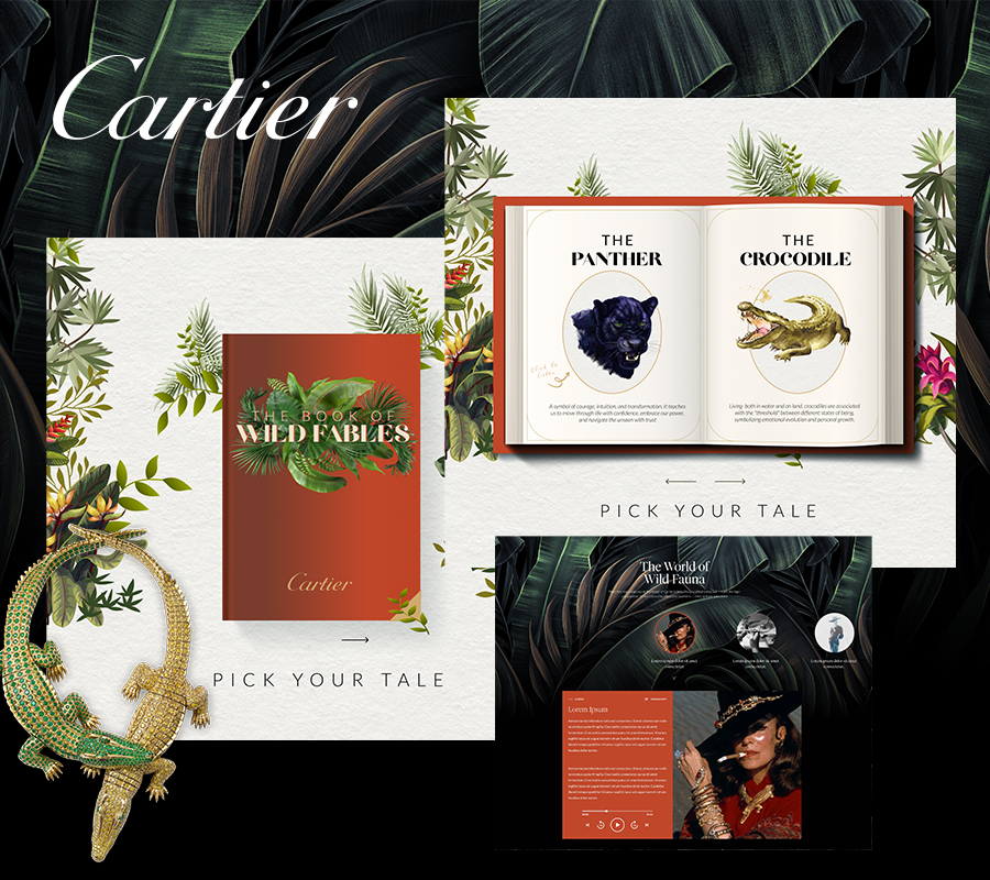 The Fauna collection was a new range of jewelry based on jungle creatures. On the initial first meetings we talked about story telling and landed on an interactive book with chapters of each creature. I created this design on Figma showing what we could design for them. I also wanted to use some moving palm leaves behind the header. As the creative director stated, it was creepy in a beautiful way!